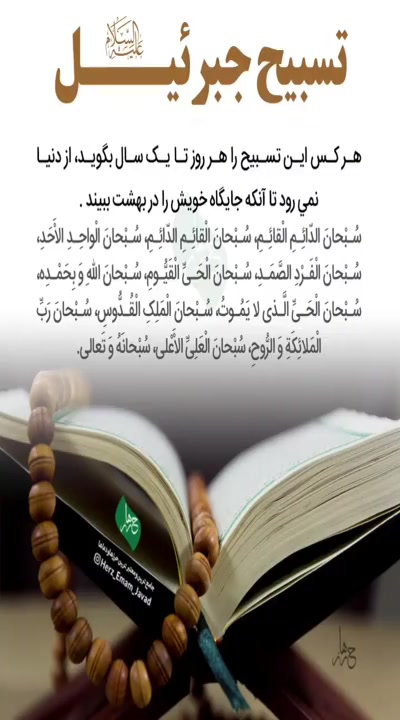 •هر كس اين تسبيح را هر روز تا يك سال بگويد، از دنيا نمى رود تا آنكه جايگاه خويش را در بهشت ببيند. (بحار الانوار : 84 / 6)