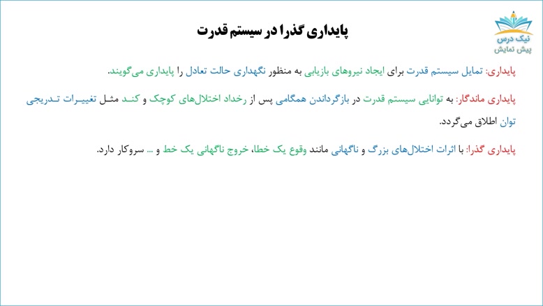 در فصل چهارم به پایداری سیستم قدرت به بررسی رفتار سیستم در برابر اختلالات مانند خطاها یا تغییرات بار میپردازد. این فصل پایداری زاویهای، ولتاژ و فرکانس را تحلیل میکند. روشهایی مانند معیار زاویه برابر برای ارزیابی پایداری معرفی میشوند.