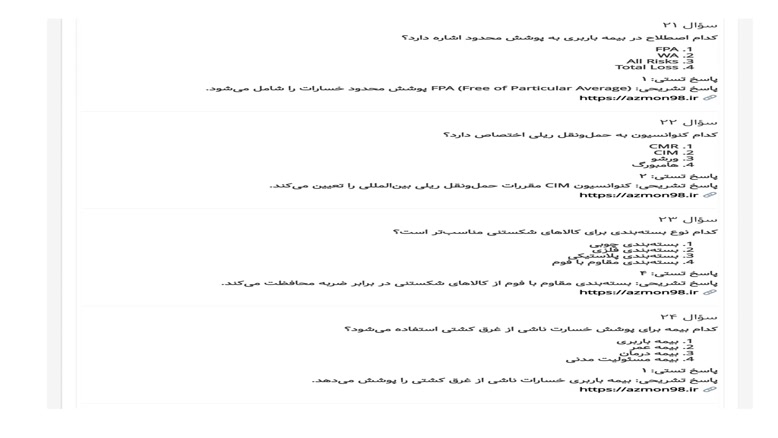 + نمونه سوالات بيمه هاي مختلف مرتبط با امور حمل و نقل بين المللي 1555سوال + پاسخنامه