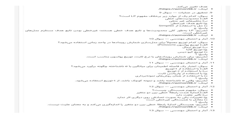 اگر دوست دارید، همان مجموعه را با فرمتهای دیگر (مثلاً PDF یا Word با پاسخنامه کلید در انتهای هر سوال یا نسخه دو زبانه) هم آماده کنم یا تمرکز را روی یکی از دستهبندیها (مثلاً اقتصاد مهندسی یا شبیهسازی سیستمها) تنظیم کنم.