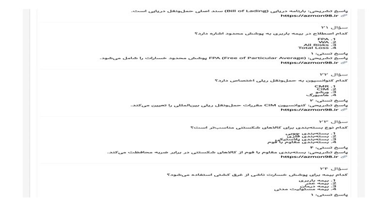 + نمونه سوالات انواع حمل و نقل بين المللي و ترانزيت كالا 1234سوال + پاسخنامه