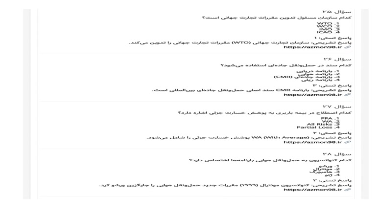+ نمونه سوالات انواع حمل و نقل بين المللي و ترانزيت كالا 1234سوال + پاسخنامه