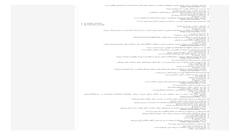 ۴۳) سوال: کدام ابزار برای مقایسه بازده پروژهها با سطح ریسک مشابه استفاده میشود؟ A) CVP Analysis B) Risk-Adjusted Return Metrics (مانند RAROC) C) فقط ROI D) Break-even Analysis جواب صحیح: B تشریح: معیارهای بازدهی-ریسک تنظیمشده برای مقایسه پروژهها با ریسکهای مختلف مناسباند. لینک مرجع: https://azmon98.ir