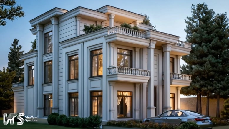 در طراحی ویلا در منطقه ی اسبچین ، توجه به استقرار بنا بر روی سکو یا کرسیچینی جهت جلوگیری از نفوذ رطوبت زمین ، استفاده از بامهای شیب دار با پیشآمدگی مناسب برای هدایت آب باران ، طراحی بازشوهای وسیع و متقابل به منظور تأمین تهویه طبیعی مؤثر و بهرهگیری از سایهبانها و ایوانهای عمیق اهمیت ویژهای دارد. انتخاب مصالح مقاوم در برابر رطوبت ، جزئیات اجرایی مناسب برای دفع آب و طراحی محوطه با پوشش گیاهی سازگار با اقلیم ، نقش اساسی در افزایش دوام بنا ، ارتقای آسایش حرارتی و تأمین کیفیت فضایی مطلوب در معماری ویلاهای این منطقه ایفا میکند.این ویلای کلاسیک در منطقهی خوشآبوهوای اسبچین واقع در استان مازندران طراحی و اجرا شده است . پروژه در زمینی به مساحت ۵۲۰ متر مربع جانمایی شده و با سطح اشغال ۱۵۰ متر مربع ، در قالب یک ویلای دوبلکس با زیربنای کلی ۳۵۰ متر مربع شکل گرفته است.